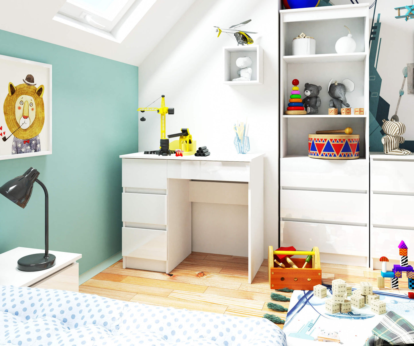 To młodzieżowe biurko komputerowe jest w kolorze białym, dzięki czemu idealnie wpasuje się w każde pomieszczenie. Bezsprzecznie kolor ten nigdy nie wyjdzie z mody, świetnie sprawdzi się zarówno do pokoju nastolatka, jak i nastolatki. Ogromną zaletą tego produktu jest fakt, że będziesz w stanie je samodzielnie zamontować, oczywiście z użyciem instrukcji, którą znajdziesz w opakowaniu mebla. Dzięki czterem pojemnym szufladom użytkownik biurka będzie w stanie przechowywać w nim komputer, książki, zeszyty, akcesoria komputerowe oraz akcesoria biurowe. Gwarancja obejmująca biurko wynosi okres 24 miesięcy. Jest to z pewnością godny zakupu mebel.