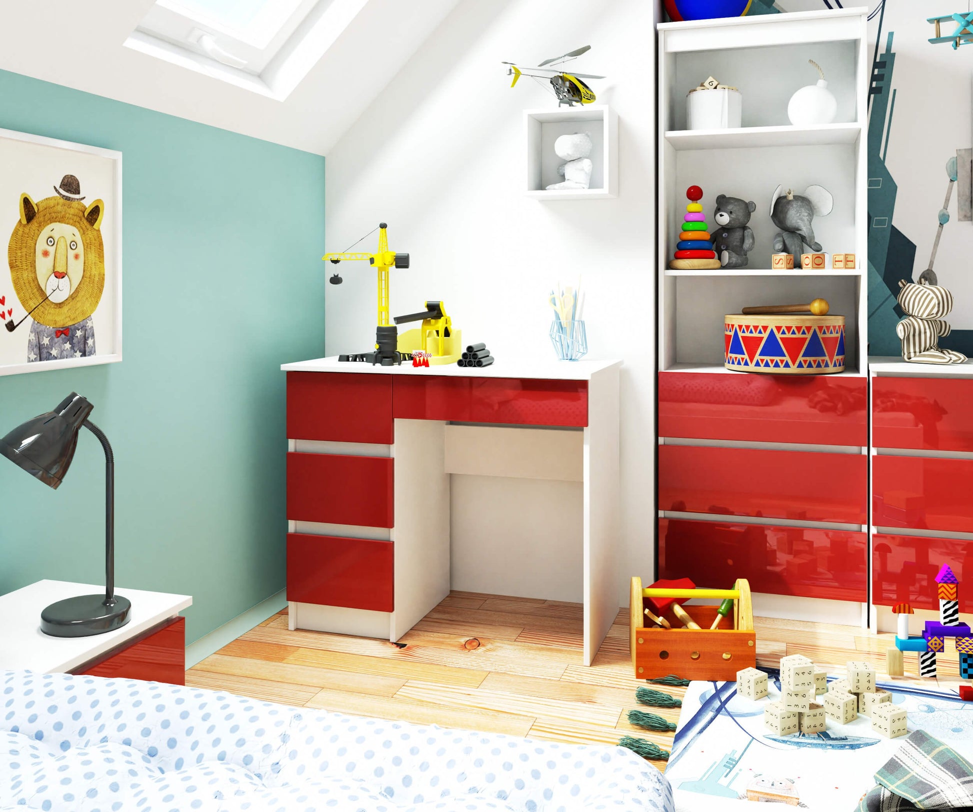 Nietuzinkowy kolor biurka przyciąga wzrok, a jego funkcjonalność sprawia, że prezentowany produkt jest w stanie sprostać oczekiwaniom nawet najbardziej wymagających użytkowników. Mebel łączy w sobie biały korpus oraz efektowne, czerwone fronty w wysokim połysku, które czynią biurko wyjątkowym. To propozycja odpowiednia do niewielkich pomieszczeń z uwagi na małe gabaryty konstrukcji. Biurko komputerowe A-7 90 cm. (lewe) składa się czterech szuflad. Znajdzie zastosowanie przede wszystkim w pokojach dziecięcych oraz młodzieżowych, ale także biurach urządzonych w nowoczesny sposób.
