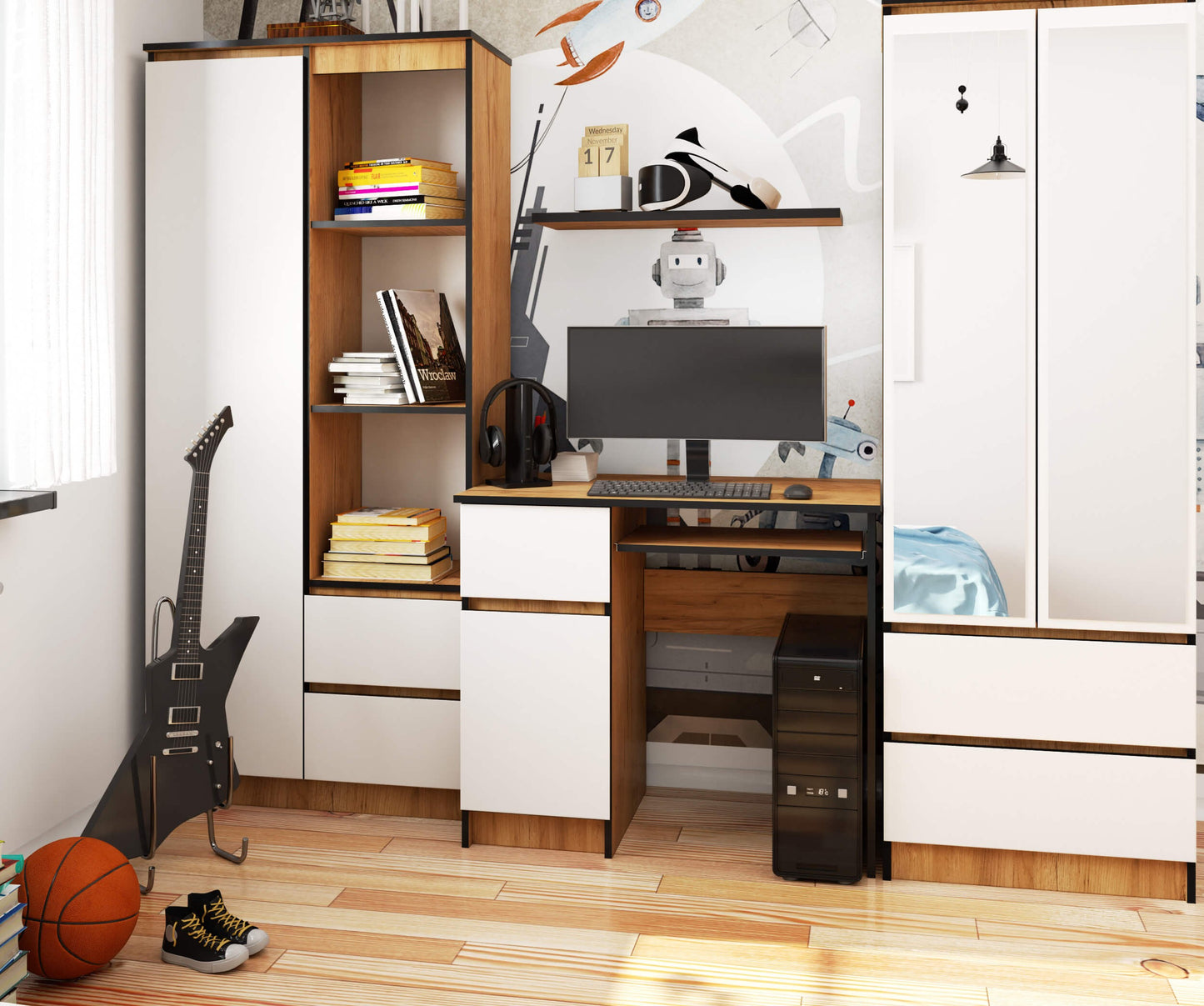 Biurko komputerowe PIKSEL dąb craft/białe świetnie nadaje się do zastosowania w pokoju dziecięcym, młodzieżowym, czy też w sypialni albo salonie, w którym wydzielony został kąt do pracy zdalnej czy nauki. Sprawdzi się także w niewielkich pomieszczeniach biurowych, doskonale współgrając z innymi meblami w systemie bezuchwytowym.