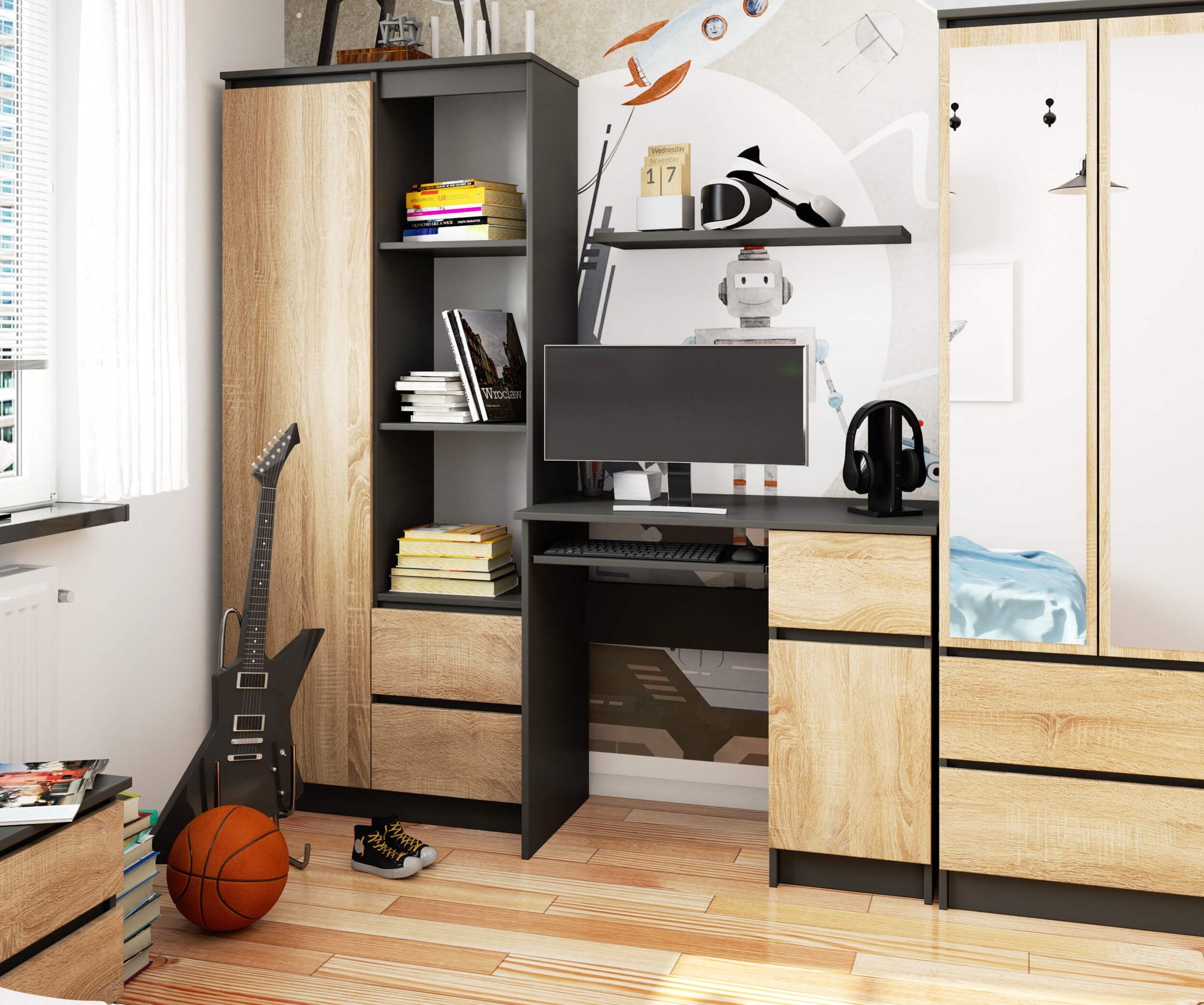 Biurko wolnostojące PIKSEL 90 cm w kolorach GRAFIT SZARY/DĄB SONOMA jest idealnym rozwiązaniem dla małych wnętrz. Bardzo dobrze sprawdzi się w roli biurka szkolnego lub komputerowego. Jego ergonomiczna konstrukcja zapewnia komfort użytkowania. Biurko zostało wyposażone w wysuwaną półkę na klawiaturę, podręczną szufladę boczną oraz szafkę z półką, w której swobodnie mogą stanąć segregatory i książki. Do wykonania biurka użyto przyjemnej w dotyku i łatwej w utrzymaniu matowej płyty pokrytej odporną na ścieranie warstwą laminatu. Całości dopełniają poręczne uchwyty w srebrnym kolorze.