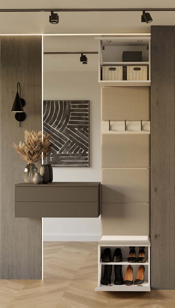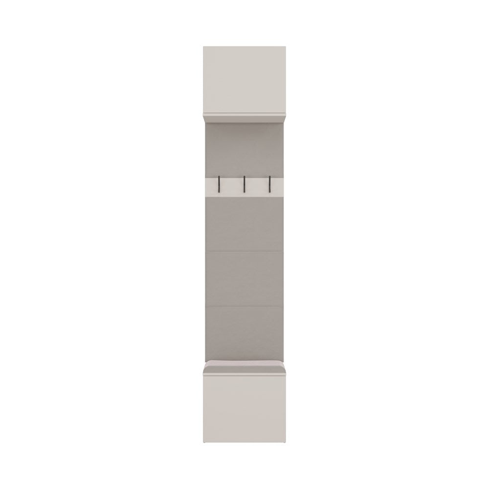 HAGA 1W to kompaktowy i funkcjonalny mebel do przedpokoju, który łączy wygodne siedzisko z miejscem do przechowywania, panel z wieszakami na odzież oraz praktyczną szafkę górną.
