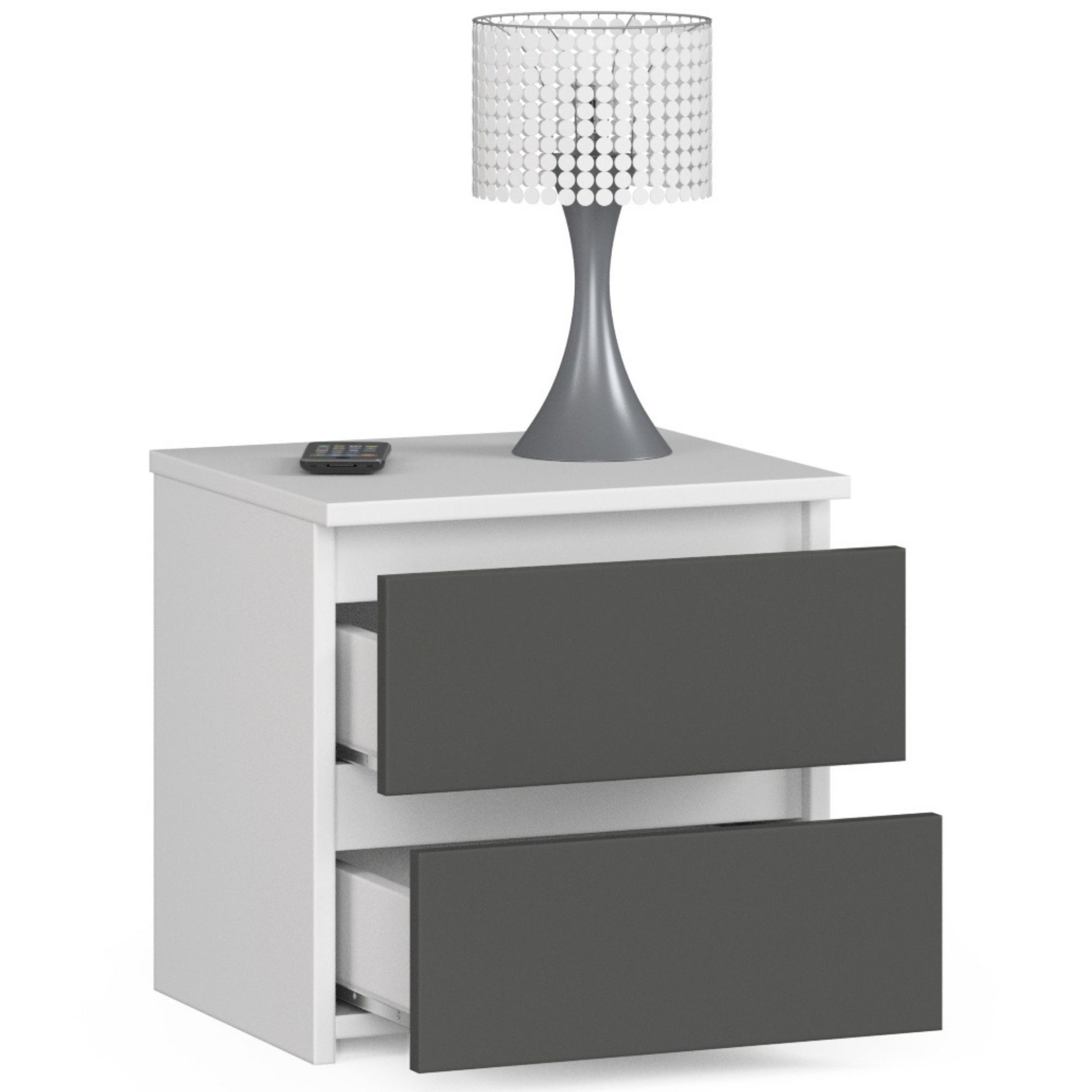 Szafki nocne to popularny tym mebla, który stawia się przy łóżku. Na jego blacie można ustawić lampkę, zaś w szufladach - ważne przedmioty, służące poprawie jakości odpoczynku i snu. W naszej ofercie dostępna jest biała szafka nocna CL2 40 cm z frontami szuflad w kolorze grafit szary. Prezentuje się ona elegancko i nowocześnie, a zarazem jest funkcjonalna. Świetnie sprawdzi się w każdej sypialni oraz pokoju młodzieżowym.