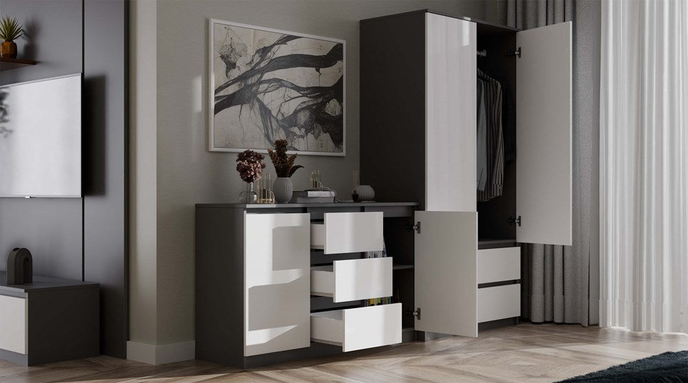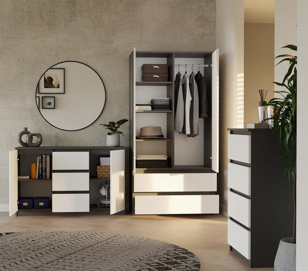 - Nowoczesne połączenie kolorów – połączenie korpusu w kolorze Antracyt z Białymi frontami nadaje komodzie elegancki i stylowy wygląd.