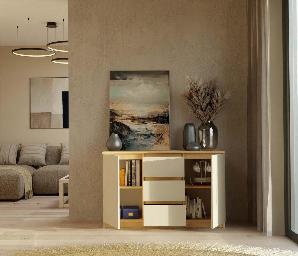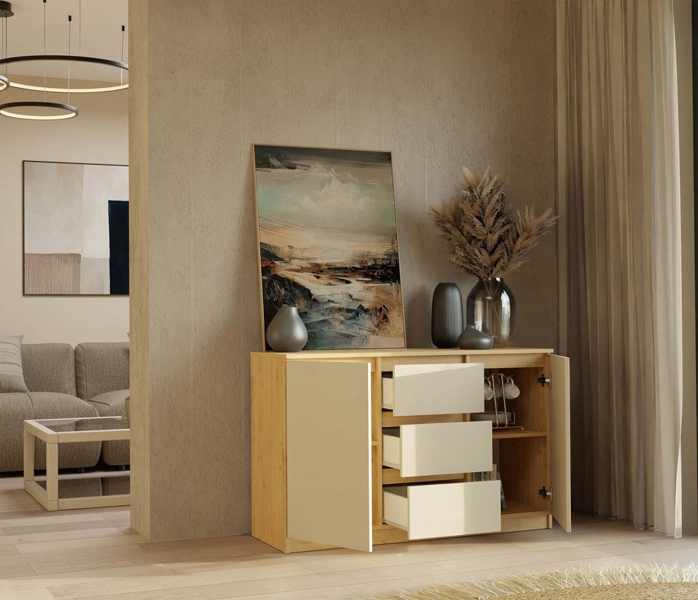 Połączenie kolorów Kaszmir oraz Dąb Artisan, nadaje komodzie nowoczesny i elegancki wygląd, który harmonijnie komponuje się zarówno z minimalistycznymi, jak i bardziej klasycznymi wnętrzami.