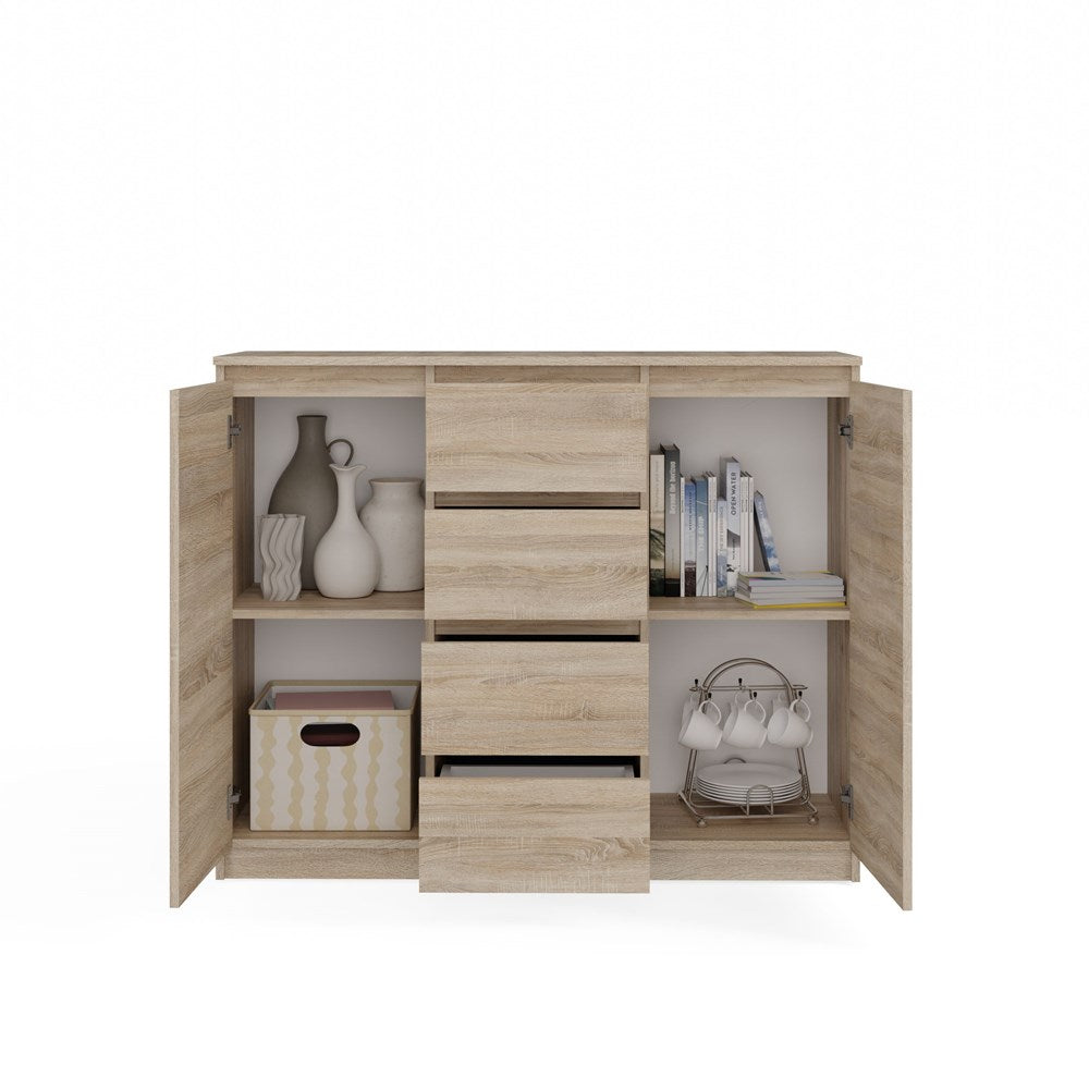Wnętrze komody składa się z półek oraz czterech szuflad, które pomogą przy rozmieszczaniu rzeczy. Łatwiej będzie znaleźć to, czego się szuka.
