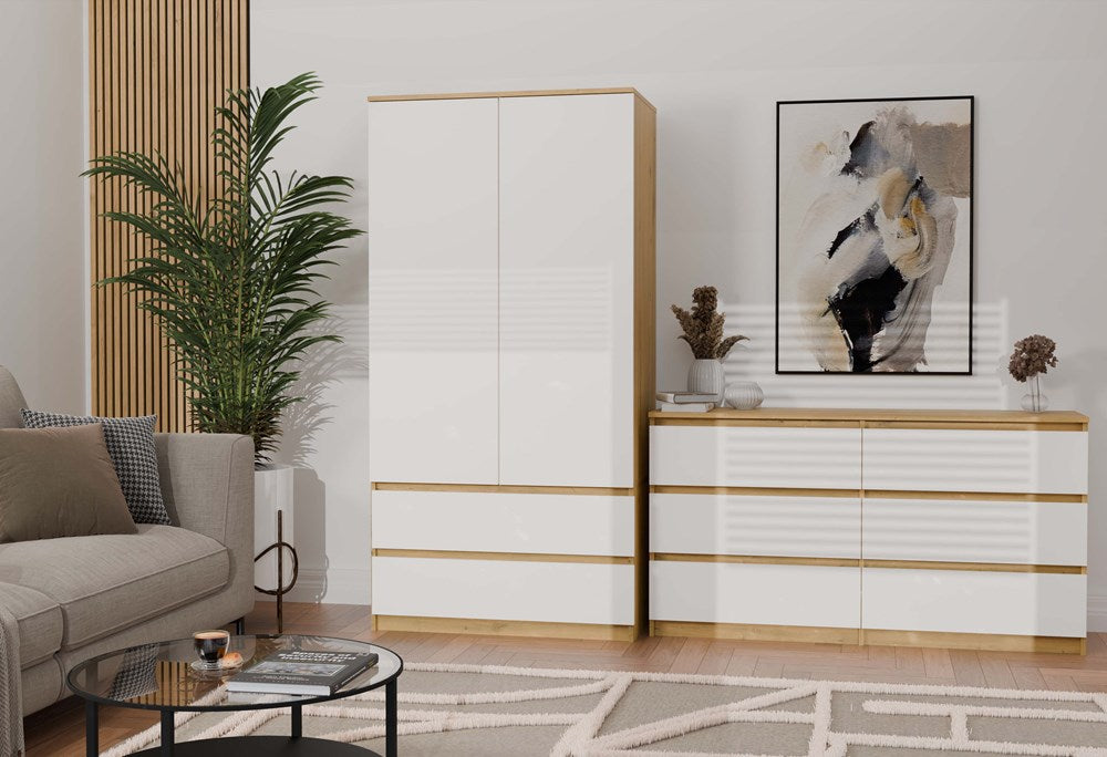 Nowoczesny, elegancki design, który łączy ciepły odcień dębu Artisan z klasycznym białym frontem, nadaje wnętrzu wyjątkowego charakteru. Zestawienie tych dwóch kolorów sprawia, że komoda doskonale komponuje się zarówno w nowoczesnych, jak i bardziej tradycyjnych aranżacjach.