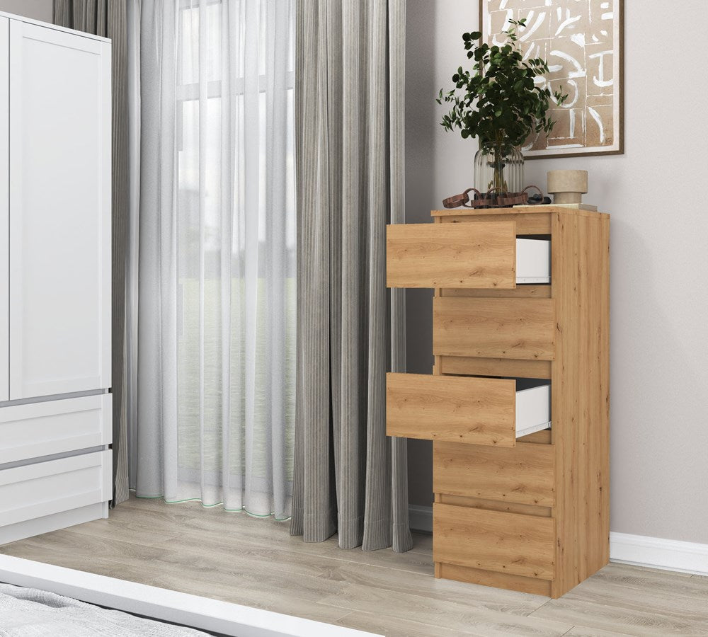 - Wysoka komoda oferuje mnóstwo miejsca do przechowywania, a nie zajmuje dużo miejsca