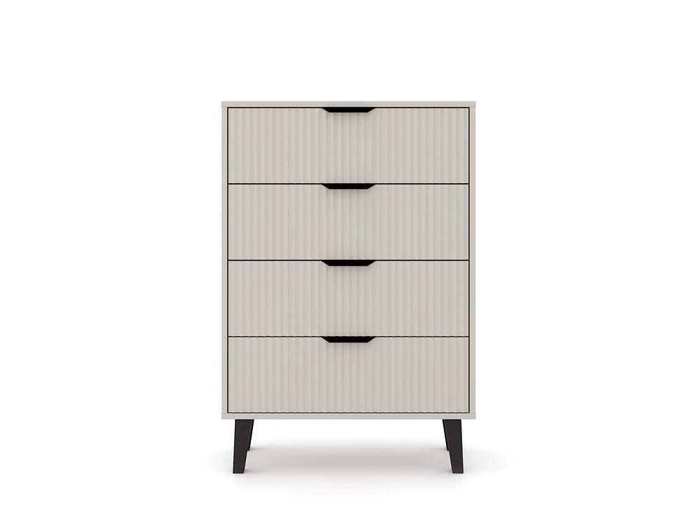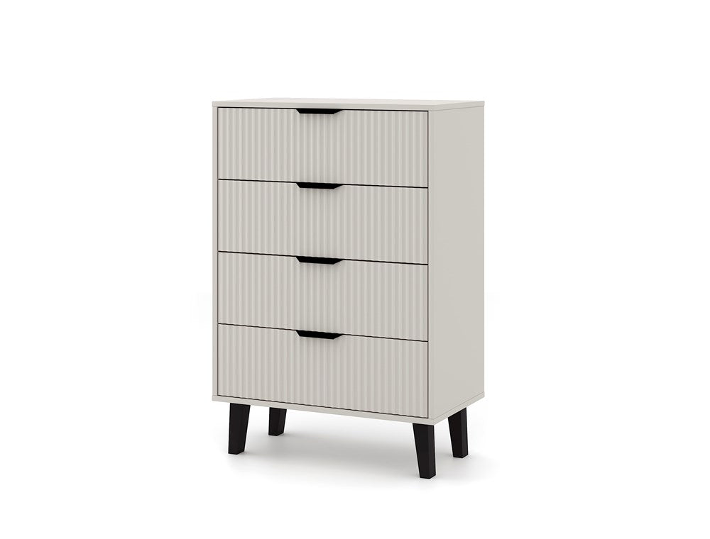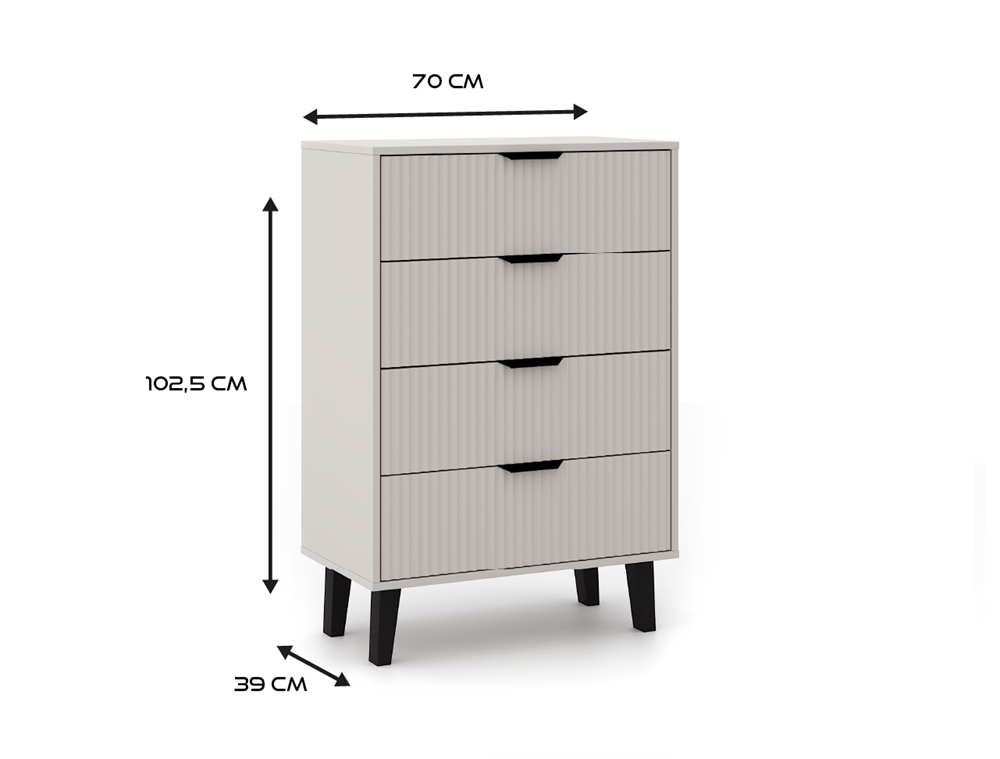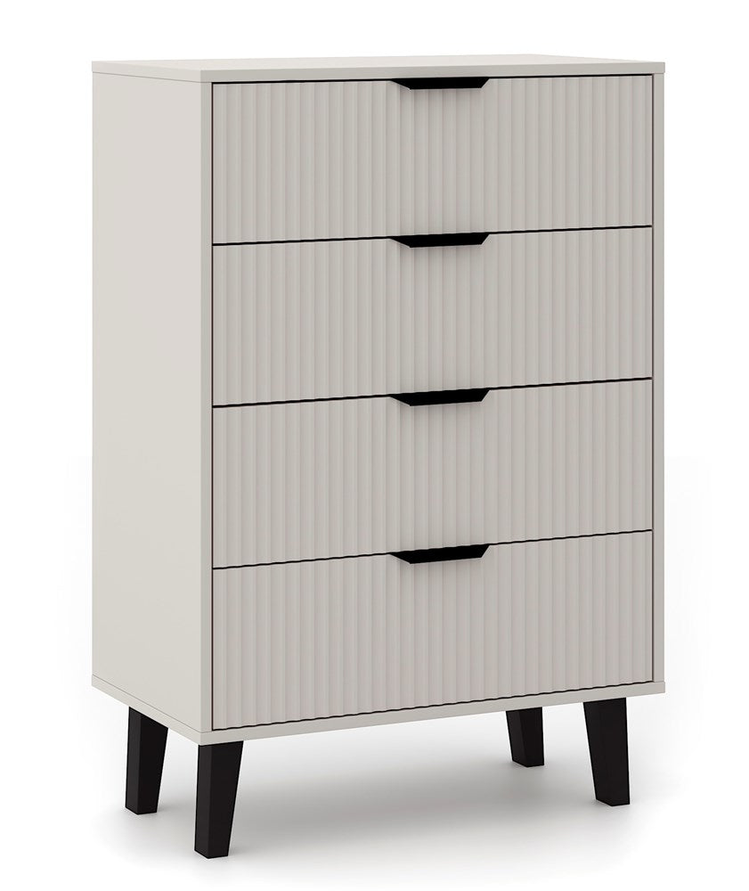 Komoda SCANDI 4S SLIM to idealna propozycja dla tych, którzy szukają praktycznego mebla do przechowywania z nutą nowoczesnego designu. Modny kolor KASZMIR w połączeniu z ryflowanymi frontami i wysokimi czarnymi nóżkami nadaje wnętrzu przytulności, a jednocześnie elegancji.