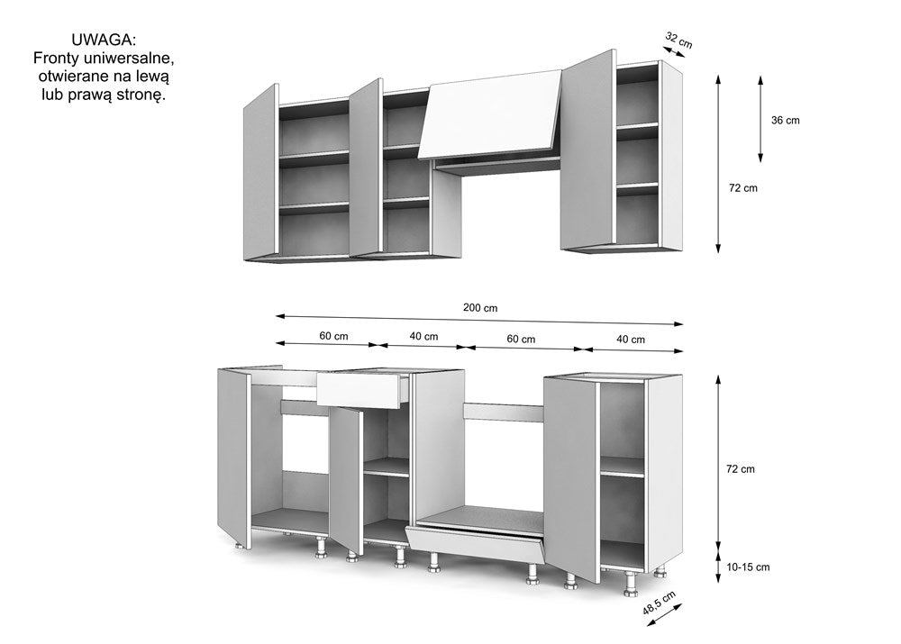 - Wysokość szafek dolnych: 72 cm + nóżki 10 cm (estetycznie przykryte cokołem o wysokości też 10 cm)