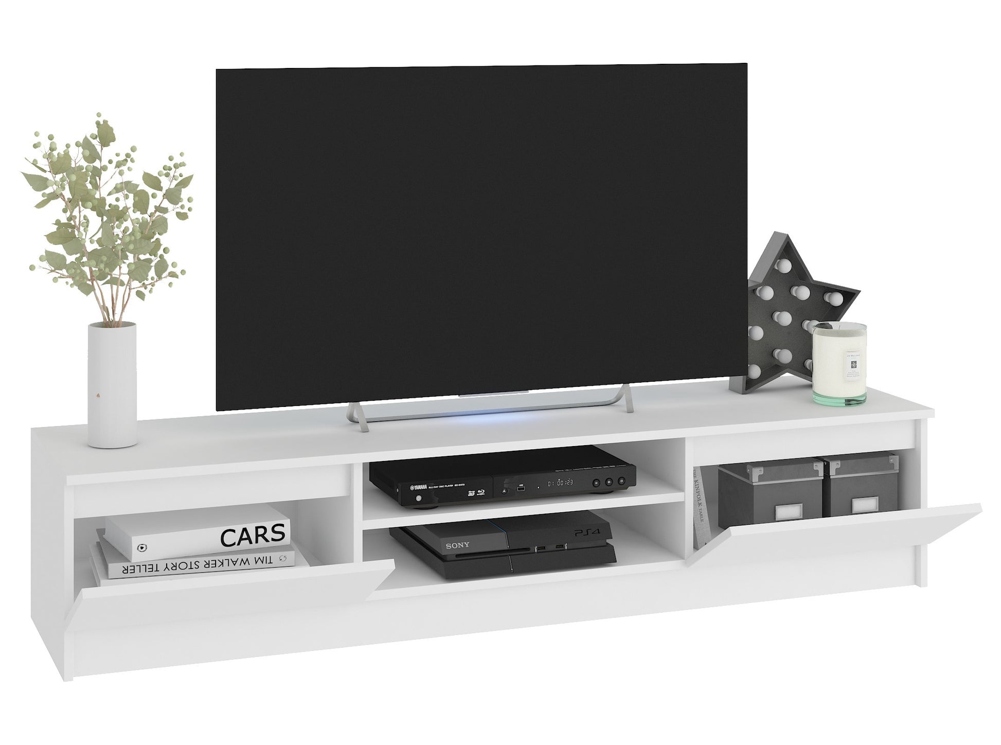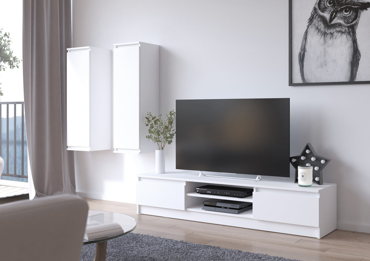Szafka RTV i szafki wiszące w kolorze białym znakomicie skomponują się z nowoczesnym wystrojem wnętrza. Odcień klasycznej bieli jest przy tym na tyle uniwersalny, że zestaw mebli będzie się efektownie prezentował zarówno w pokoju, w którym dominuje pastelowa kolorystyka, jak i w salonie ze ścianami czy dywanem w ciemniejszej tonacji. Meble zostały wykonane z płyty laminowanej wykończonej obrzeżem ABS, która jest odporna na ścieranie, zarysowania i długotrwałe użytkowanie.