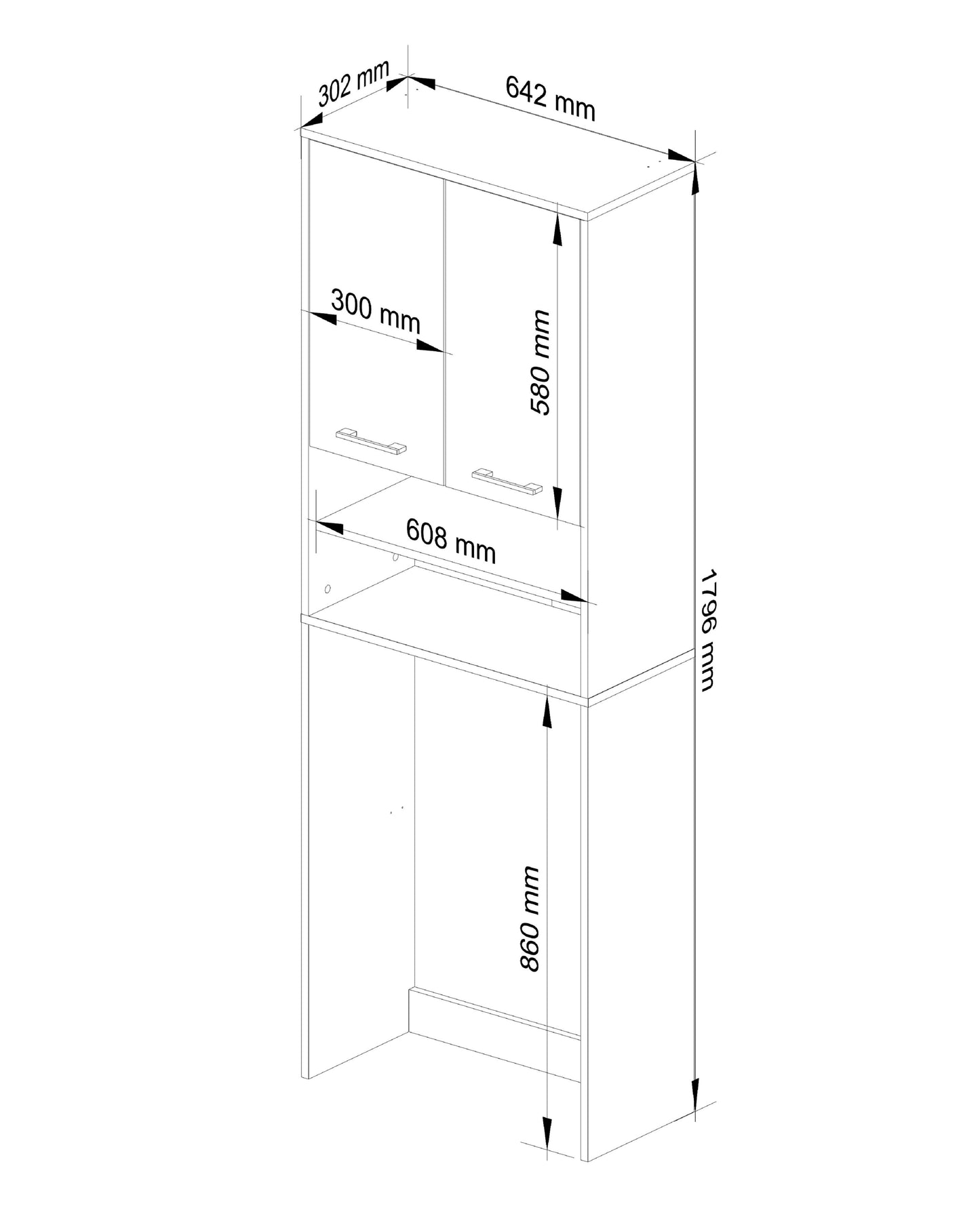 Regał łazienkowy nad pralkę, przeznaczony do zabudowy urządzenia o szerokości 60 cm i wchodzący w skład systemu mebli FIN. Model posiada otwartą przestrzeń przeznaczoną do wstawienia pralki, do tego 2 otwarte półeczki na różnego rodzaju łazienkowe akcesoria i wreszcie dwudrzwiową szafkę z 2 półkami do przechowywania ręczników i innych niezbędnych w łazience przedmiotów. Regał, ze względu na swój charakter, należy po montaży przymocować do ściany. Polecamy ten model w połączeniu z innymi regałami i słupkami z rodziny FIN.