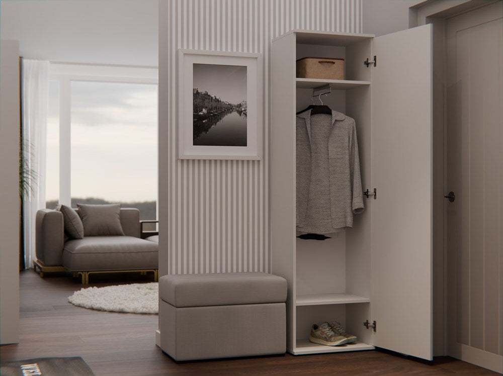 - Opcja Rozbudowy: Możliwość zakupu garderoby DUO - szafa DUO + dodatkowa dostawka z szafką oraz wieszakami.