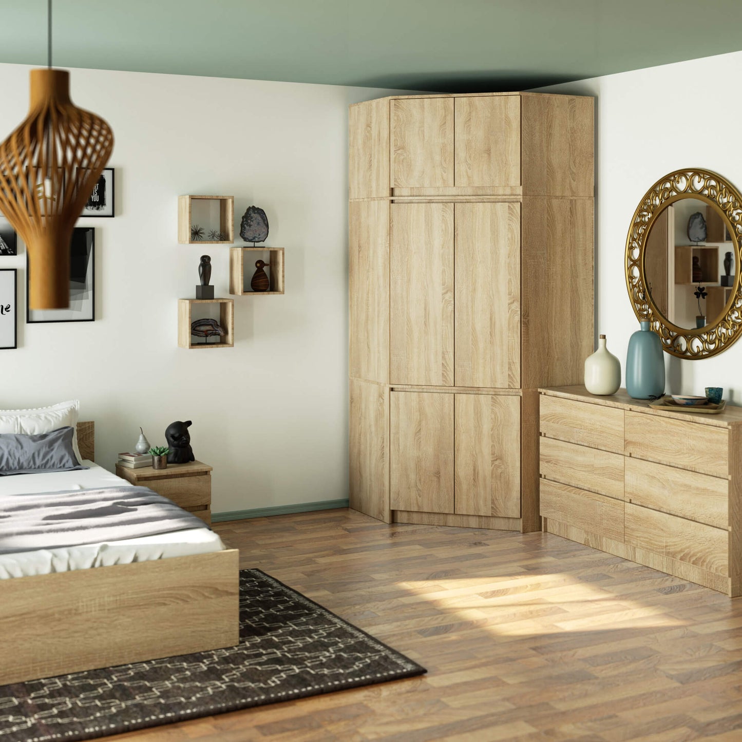 Szafa narożna z nadstawką ubraniowa sześciodrzwiowa wykonana została z odpornej na ścieranie płyty laminowanej Kronospan. Korpus mebla stanowi płyta w kolorze dąb sonoma, fronty pokryte są laminatem w kolorze dąb sonoma. Szafa składa się z 2 segmentów. Dolny to cztery drzwi, 6 półek oraz drążek na ubrania wiszące. Umieszczony najwyżej segment stanowi nadstawka zamykana dwojgiem drzwi. Nadstawka wyposażona jest w 3 półki.