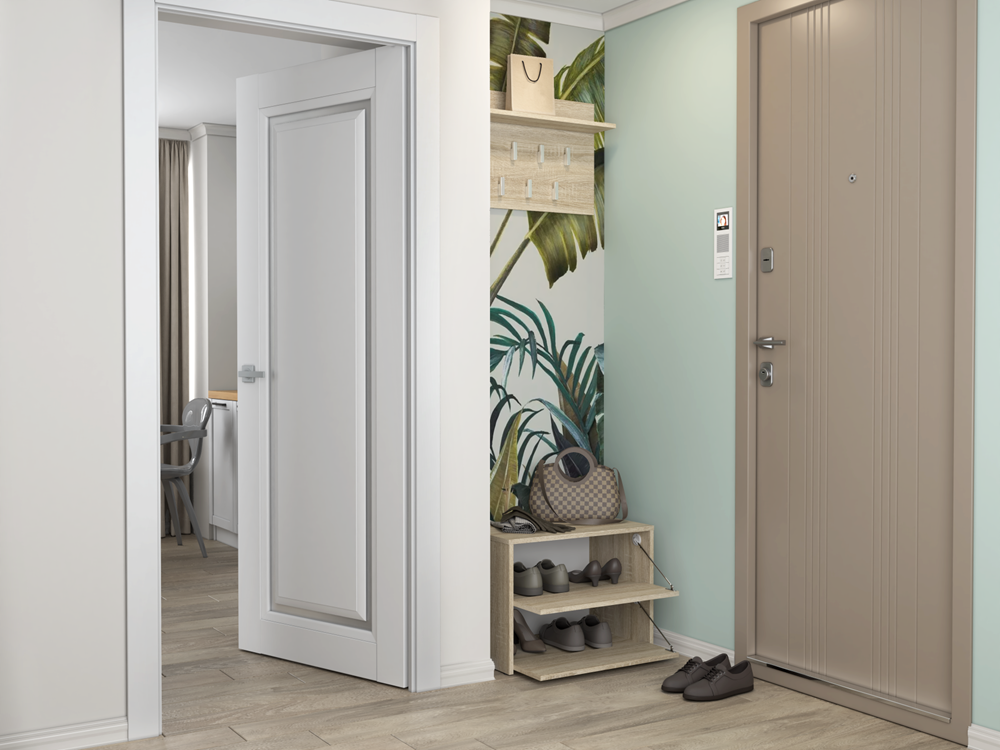 - Za drzwiczkami znajdują sie 2 pojemne półki na obuwie