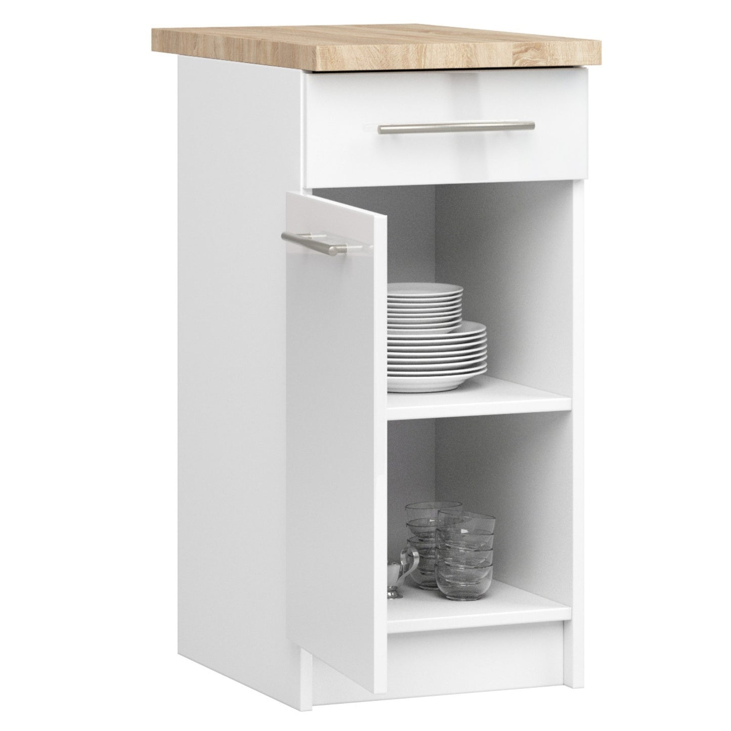 Biała szafka kuchenna z blatem w kolorze dąb sonoma z frontami w połysku. Szafka do zabudowy kuchennej modułowej.