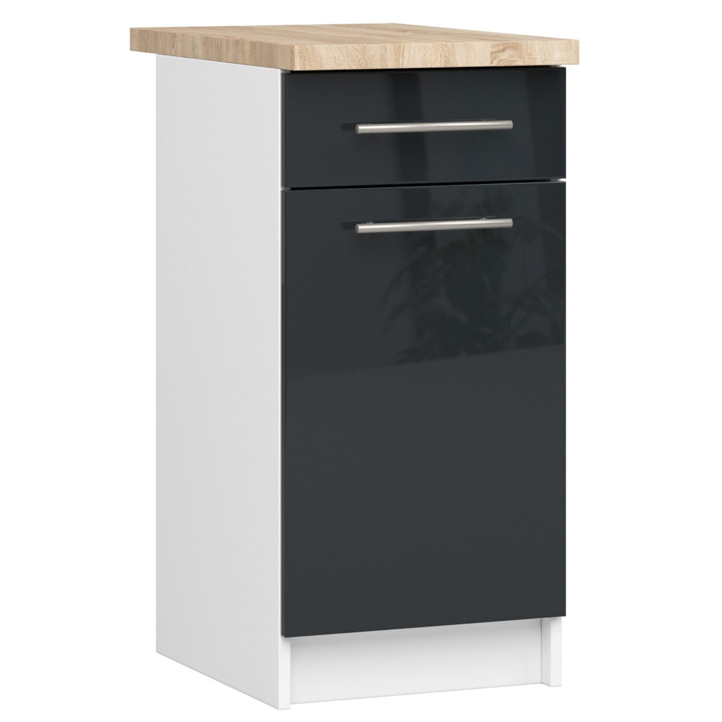 Szafka kuchenna zaprojektowana w modnym kolorze białym, wyposażona w dębowy blat, fronty w kolorze grafit połysk oraz nowoczesne uchwyty w kolorze inox zapewniające długie i bezproblemowe użytkowanie, to ciekawa propozycja dedykowana wszystkim osobom pragnącym stworzyć ponadczasowe, funkcjonalne wnętrze. Mebel przeznaczony do zabudowy kuchennej modułowej charakteryzuje się przede wszystkim nowoczesnym designem, ale także doskonałą jakością. Produkt został wykonany z trwałej i odpornej na ścieranie płyty laminowanej, która jest gwarantem jego długowieczności. Praktyczna szafka kuchenna wykorzystująca dwa najmodniejsze kolory, jest łatwa w utrzymaniu czystości, a dodatkowo dostępna w świetnej cenie. Zachęcamy do skorzystania z przygotowanej przez nas oferty, a także poznania innych mebli kuchennych pochodzących z tej kolekcji, dzięki którym każdy będzie w stanie stworzyć kuchnię swoich marzeń.