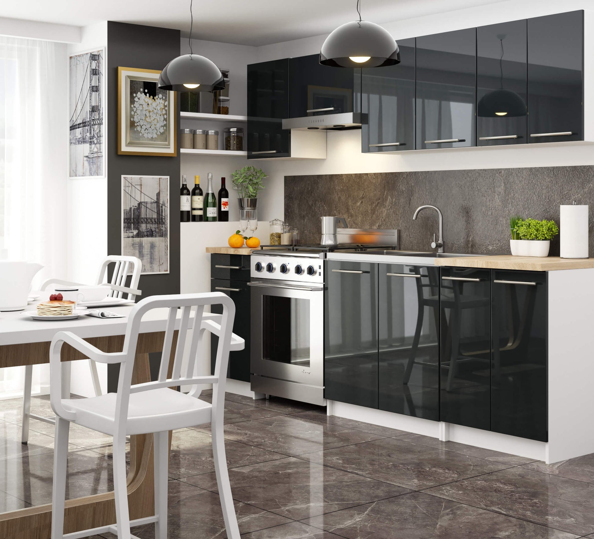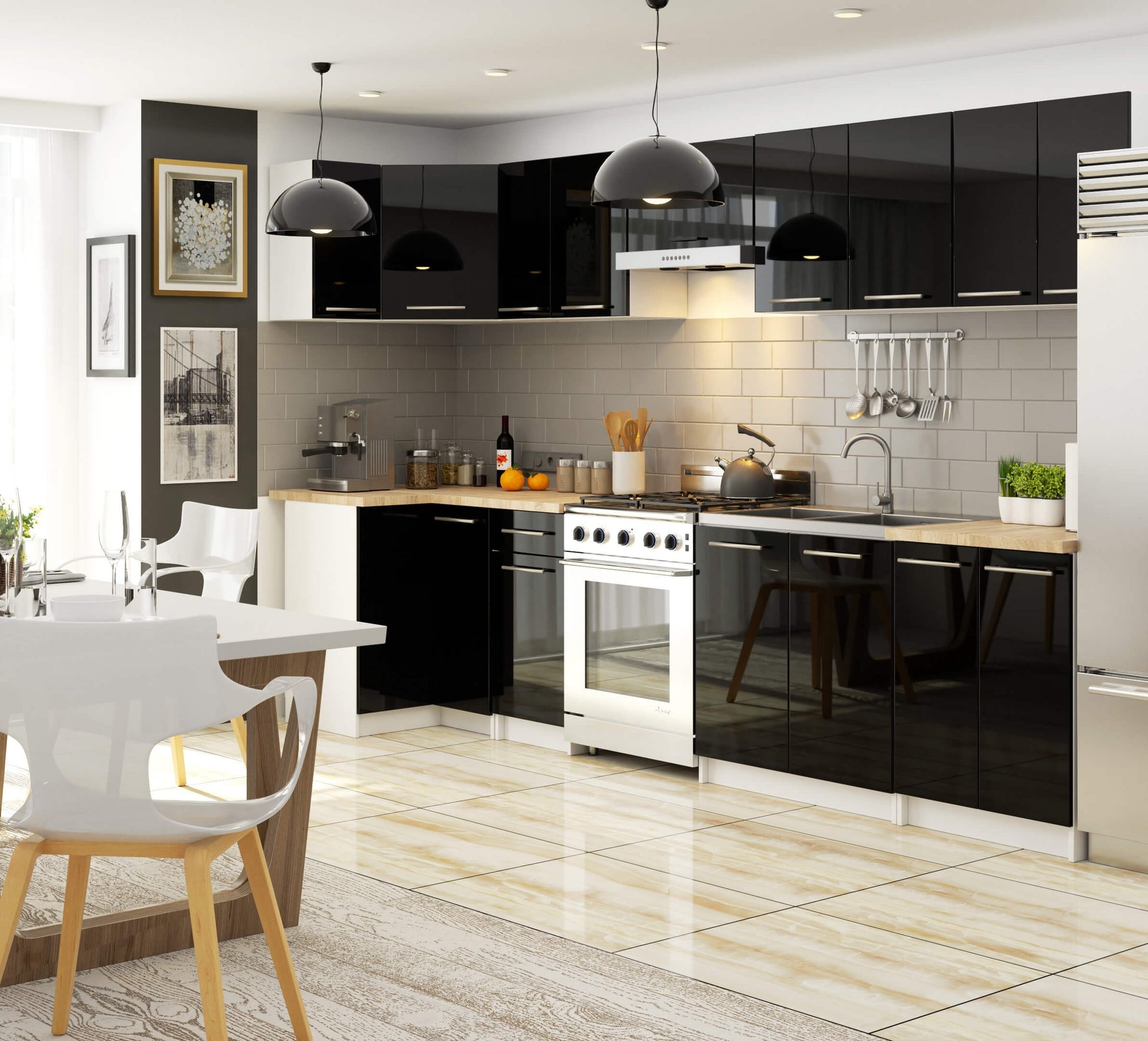 Biała szafka kuchenna z blatem w kolorze dąb sonoma i frontami w połysku. Szafka do zabudowy kuchennej modułowej.
