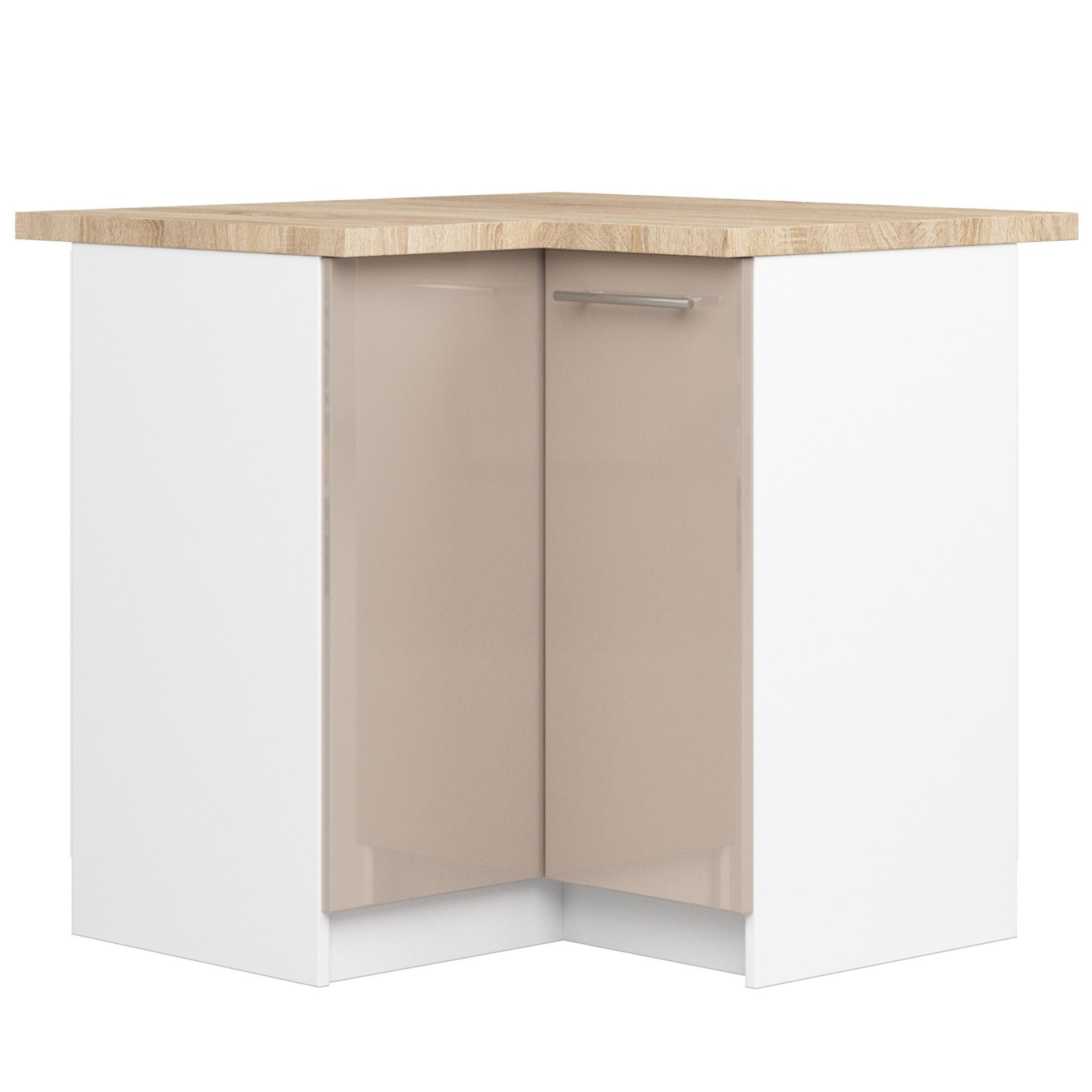 Biała narożna szafka kuchenna 90cm na 90cm z frontami cappuccino połysk. Szafka do zabudowy kuchennej modułowej.