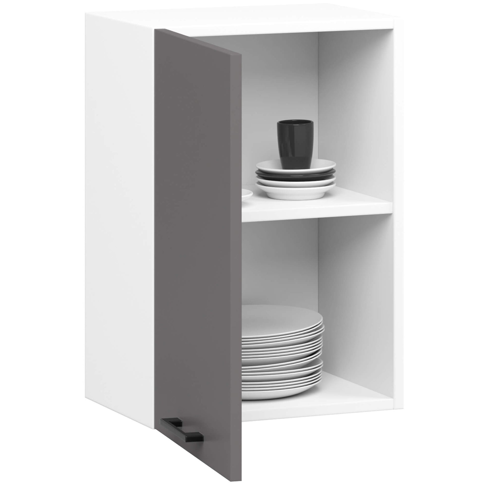 Wisząca szafka kuchenna Oliwia W 40cm w kolorze białym z frontem szarym pochodzi z zestawu mebli systemowych, dzięki którym stworzą Państwo kuchnię swoich marzeń. Wnętrze szafki posiada jedną półkę, która może służyć przechowywaniu naczyń lub produktów spożywczych.