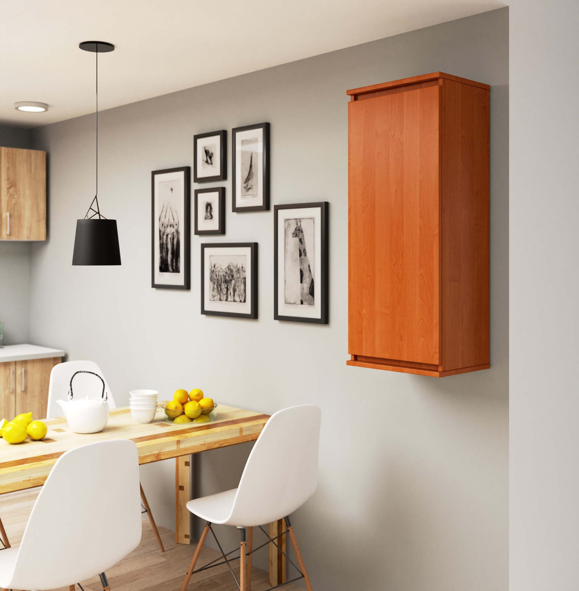 Szafka została stworzona do kompletu składającego się w gustowną meblościankę. Nowoczesny wzór, solidna konstrukcja oraz wygoda użytkowania sprawiają, że mebel jest chętnie wybierany przez osoby pragnące stworzyć w swoim mieszkaniu funkcjonalną oraz atrakcyjną pod względem wizualnym przestrzeń. Wisząca witryna została zaprojektowana w taki sposób, aby nie trzeba było do jej otwierania żadnych uchwytów. To mebel charakteryzujący się odpornością na uszkodzenia oraz wytrzymałością. Dzięki sposobie montażu do ściany, możliwe jest czyszczenie powierzchni przy pomocy robotów sprzątających.