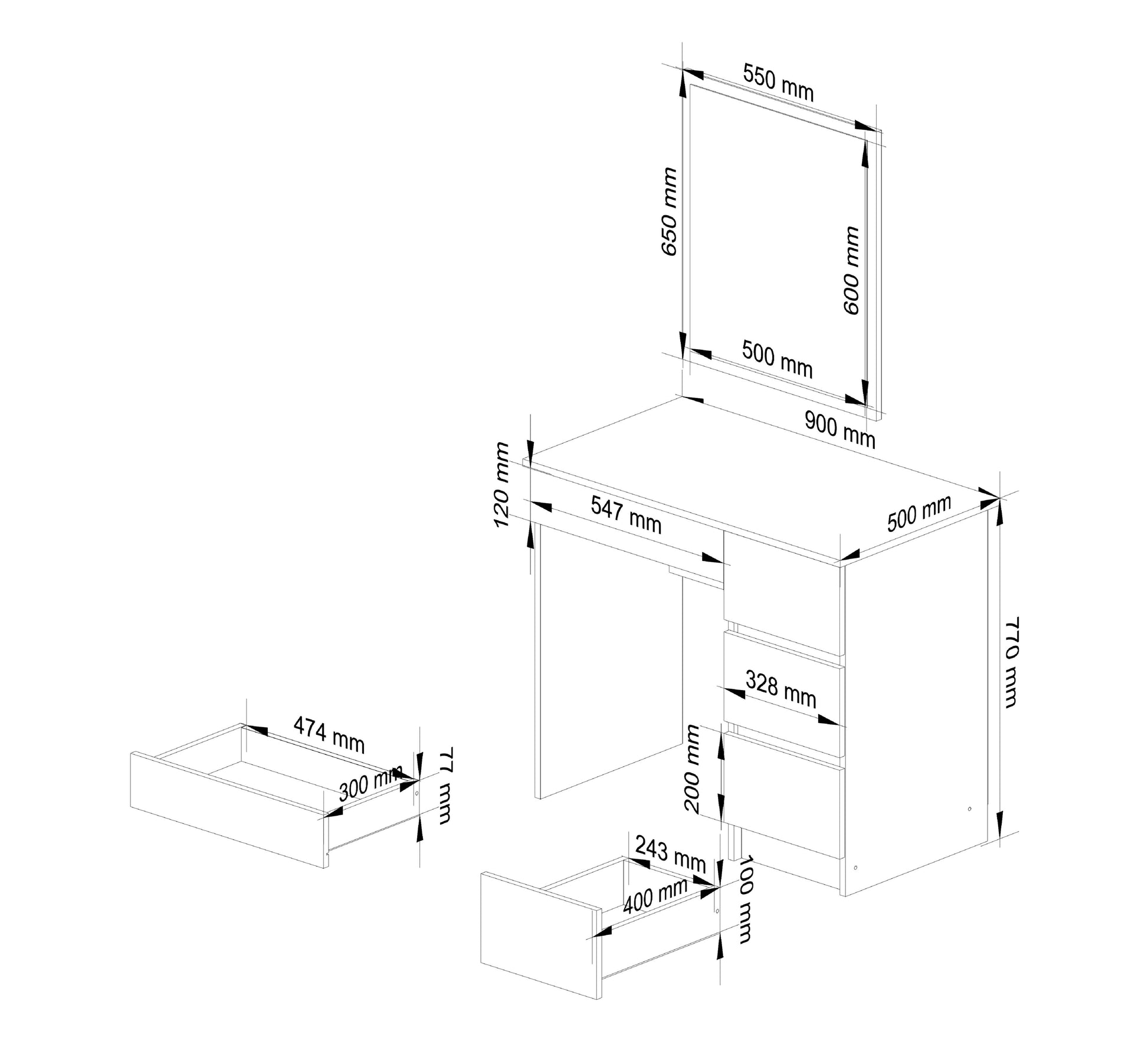Toaletka to biurko A-6 oraz dodatkowa szuflada wraz z panelem lustra.