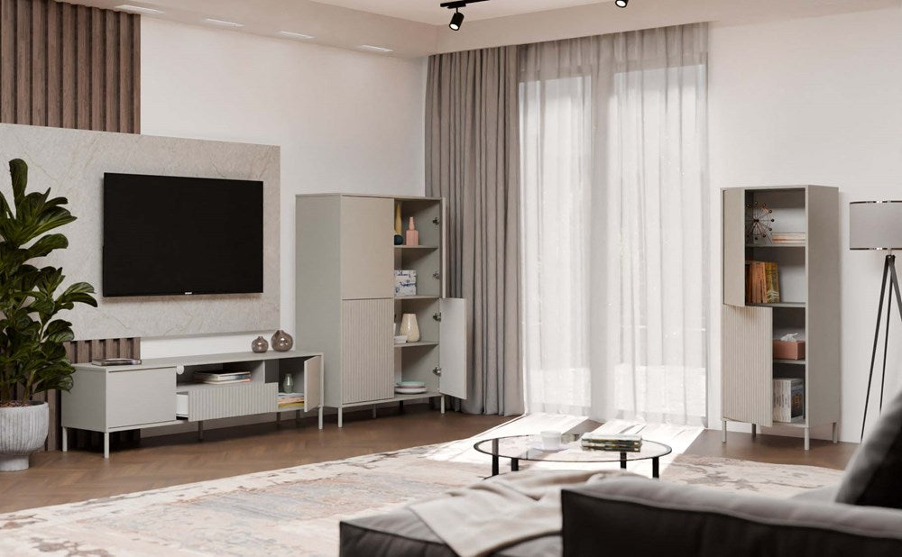 Witryna KAMARO 4DK to nowoczesny i funkcjonalny mebel, który świetnie sprawdzi się w salonie, pokoju gościnnym, sypialni czy gabinecie. Dzięki większej szerokości (103,5 cm), oferuje jeszcze więcej przestrzeni do przechowywania, zachowując elegancki i loftowy charakter. Połączenie drzwi z gładkim frontem oraz drzwi z ryflowanym wykończeniem dodaje stylowego kontrastu, a system TIP-ON umożliwia wygodne otwieranie bez uchwytów.